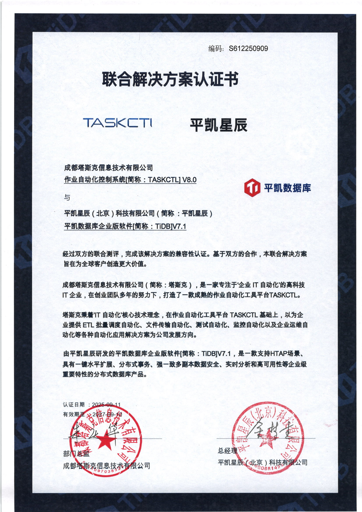 近日,平凯数据库(TiDB 企业版)与成都塔斯克信息技术有限公司的作业自动化控制系统完成深度湖认证,该企业是国内首家通过金融信创生态实验室认证的批量调度厂商。双方联合方案将充分发挥“调度+存储”技术协同优势,为金融行业大规模复杂作业调度场景提供高效可靠的支撑,破解核心业务运维痛点。