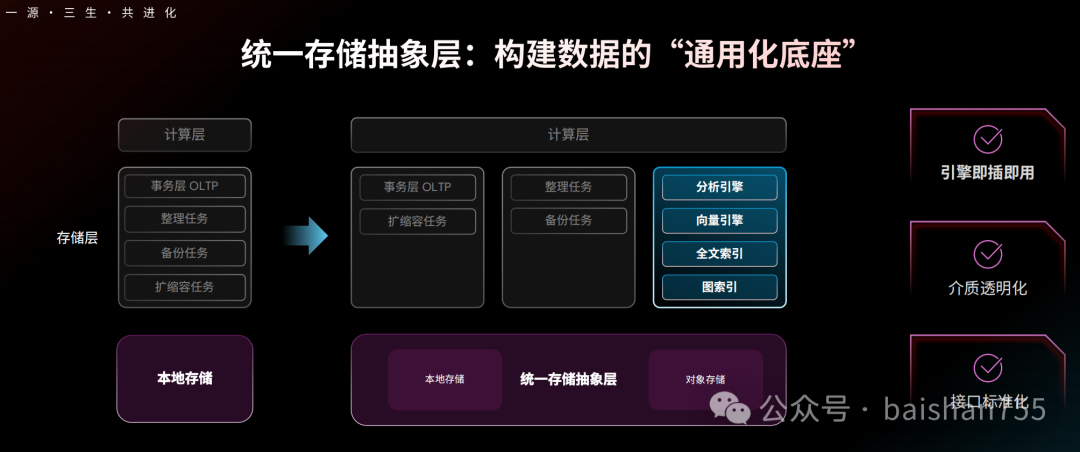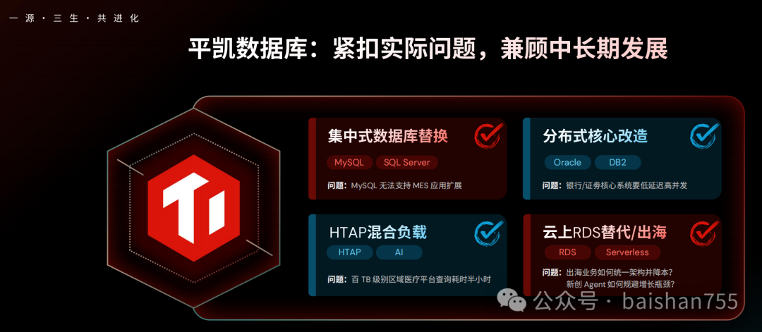 存算分离2.0架构在横向上可以更好地支持AI时代的多模态数据,在纵向上则很好地抽象了存储层,更加便于整合各种存储资源。计算隔离技术让在线任务与离线任务之间的 影响降到最低,可能是解决LSM-TREE存储架构老大难的数据合并问题的一剂良药。AI时代的业务场景与业务形态是持续演变的,应用也会完全脱离现有的菜单、模块、功能点的架构。面对AI时代的数据库产品,也必然会面对不确定性的挑战。TiDB的新一代内核给企业提供一个高稳定、高韧性、极致成本灵活性的数据底座,能够积极拥抱上层应用的不确定性。2026年初的第一场国产数据库产品发布会,让我看到了一个熟悉又陌生的PingCAP,我既看到了数据库厂商对用户场景的积极响应,也看到了对未来数据库技术的积极探索。在中国这个具有丰富场景,充满挑战的数据库应用环境中,TiDB应该是有光明前景的。