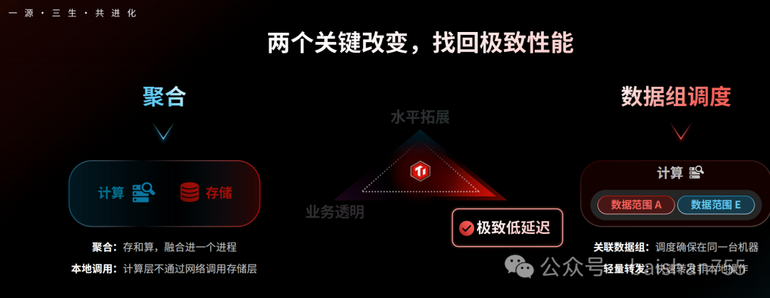 聚能模式则以一种令人意外的模式出现。TiDB Server与TiKV被整合在一个进程空间内,两个功能组件之间保持独立的前提下,可以通过内部调用实现计算与数据物理的“亲和”,消除了分布式架构中原本不可避免的网络开销,将关键应用的延时降低到原来的1/4。刚刚看到这个架构的时候,我是有些吃惊的,难道PingCAP要放弃自己的云原生分布式理念了吗?仔细了解后我不禁对PingCAP的这种新设计竖起大拇指。在聚能模式下,对于延时不敏感的应用,用户还可以像以前一样使用TiDB数据库,不过对于一些对于延时要求极低的应用,则可以利用聚能模式的“近距离存算”的架构进行单元化设计,在一个独立的进程空间里完成低延时的数据计算。TiDB并没有放弃其云原生分布式数据库的理念,而是针对某些特定场景做出了妥协,我们必须为这种妥协点赞,数据库产品必须服务于应用场景。