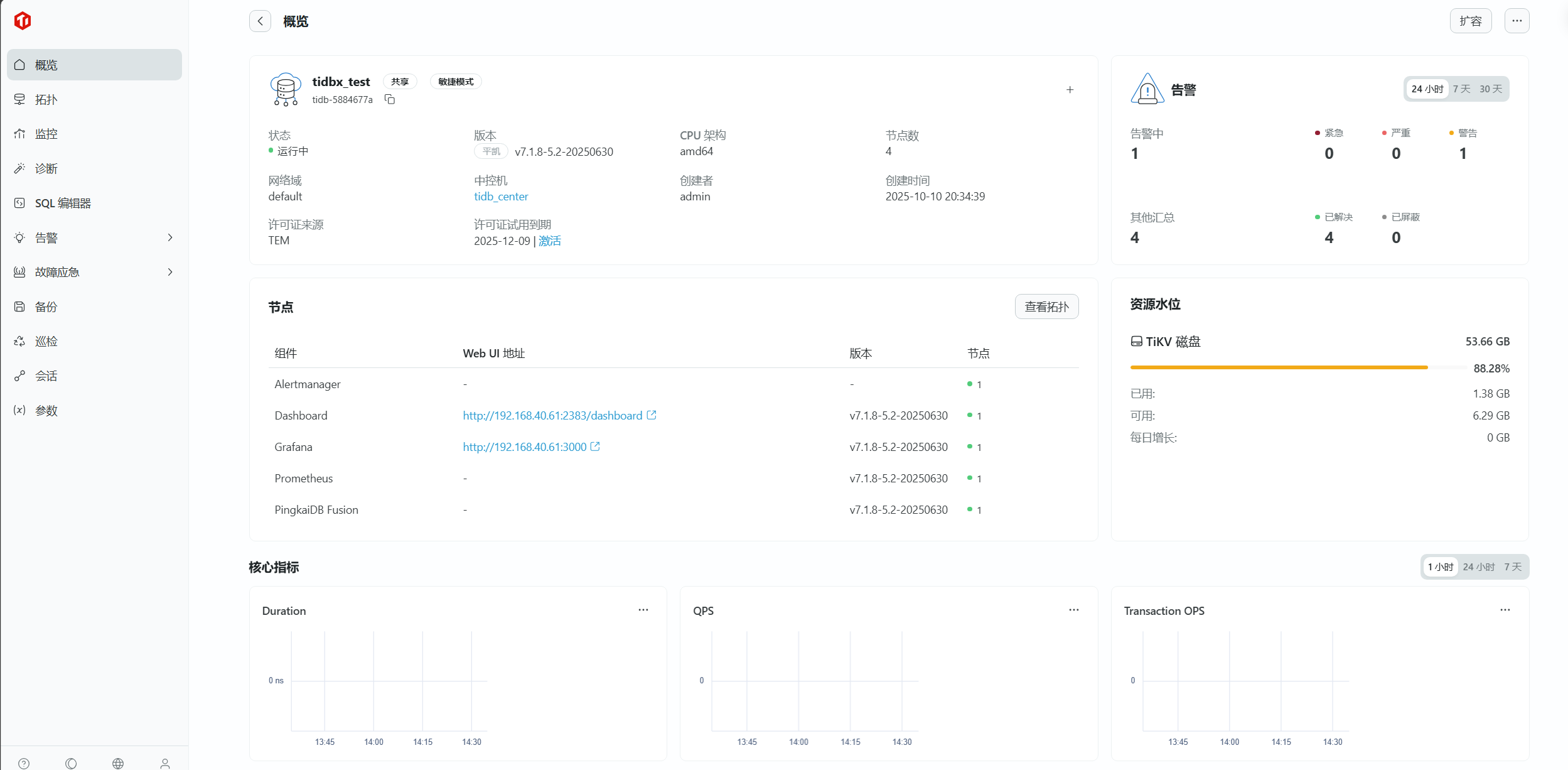 tiup cluster deploy更直观; - 多集群管控:同时管理测试集群(3节点)和生产集群(1节点),支持统一监控、告警、备份策略;