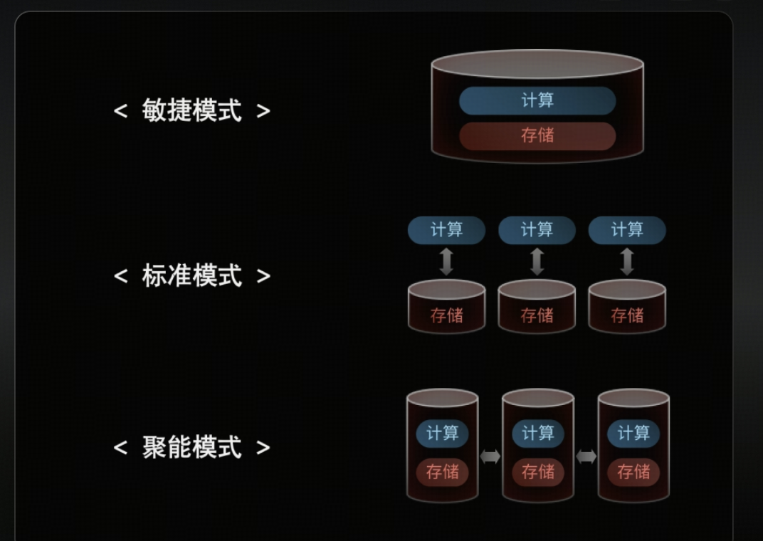 聚:在资源受限或追求极致低延迟时,通过亲和性调度让计算与存储“聚合”(如敏捷模式、聚能模式),获得单机般的性能体验。