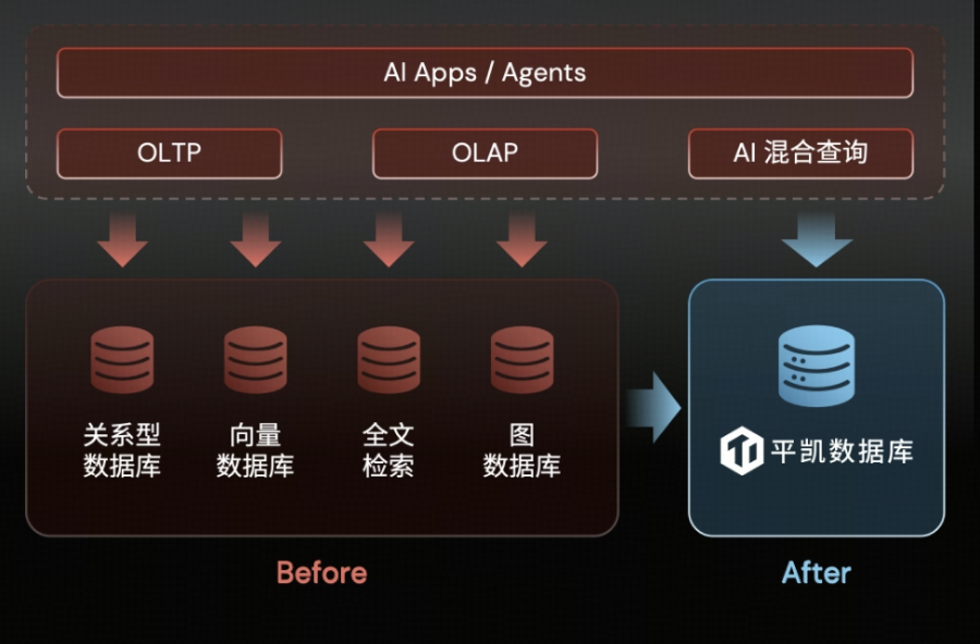 AI 时代不需要割裂的组件拼凑,而需要统一的数据底座。平凯数据库新一代内核集成了交易、分析、向量和全文检索能力。你无需在不同数据库间来回倒腾数据,一套系统即可支撑复杂的 AI 应用与核心业务,让架构回归极致简洁。