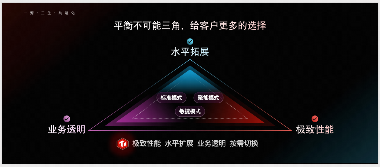 过去,企业在水平扩展、业务透明和极致性能之间只能做三选二。现在,通过一套内核三种模式,彻底打破了这一制约。无论您是初创起步还是超大规模核心场景,都能在同一个技术体系内找到最优解,无需再做艰难取舍。