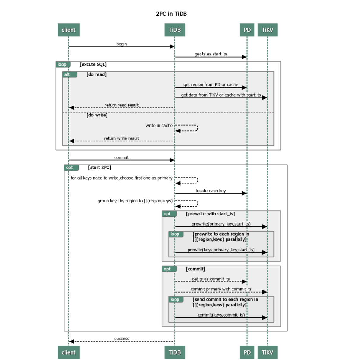 - TiDB 开始两阶段提交将事务原子地提交,数据真正落盘。 a. TiDB 从当前要写入的数据中选择一个 Key 作为当前事务的 Primary Key。 b. TiDB 从 PD 获取所有数据的写入路由信息,并将所有的 Key 按照所有的路由进行分类。 c. TiDB 并发向所有涉及的 TiKV 发起 prewrite 请求,TiKV 收到 prewrite 数据后,检查数据版本信息是否存在冲突、过期,符合条件给数据加锁。 d. TiDB 收到所有的 prewrite 成功。 e. TiDB 向 PD 获取第二个全局唯一递增版本,作为本次事务的