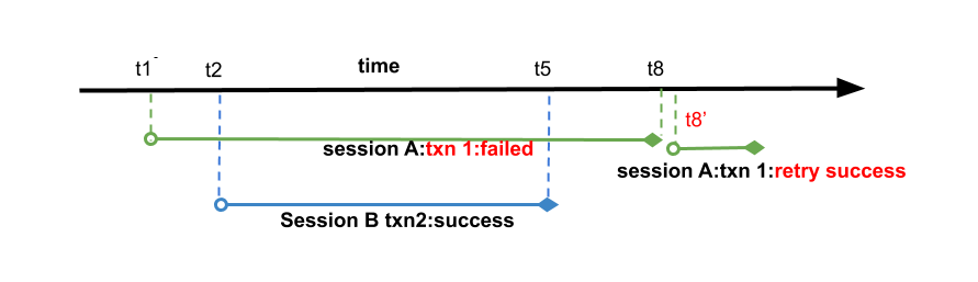 session A 提交事务 1 时,发现冲突,tidb 内部重试事务 1。