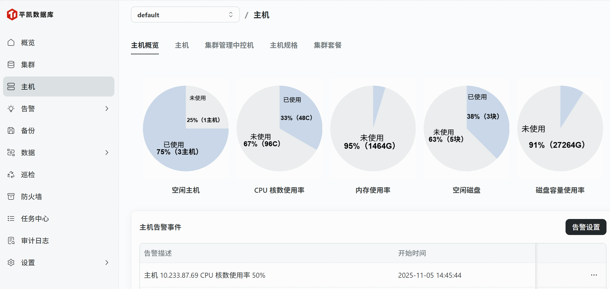 此页面展示主机的概览信息,包括:主机使用情况(空闲主机)、CPU 使用率、内存使用率、空闲磁盘情况、磁盘使用率。同时,也可以根据 告警设置 中配置的阈值显示主机告警事件,例如告警设置主机 CPU 使用率 50% 为阈值,当有主机实际 CPU 使用超过 50% 时即会产生告警事件。
