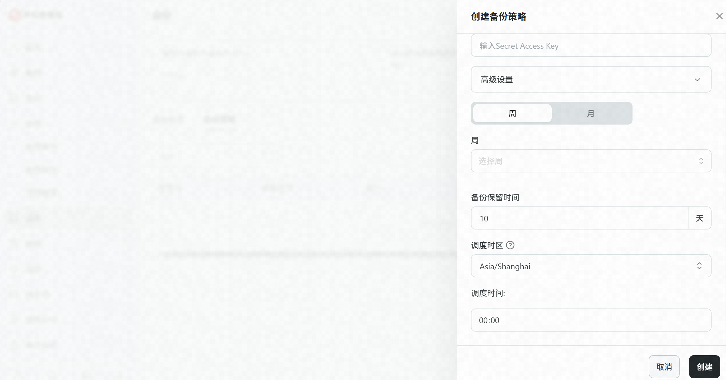 如果没有相应的备份策略,我们也可以通过 创建备份策略 按钮创建,此时除了要设置备份的类型、地址等常规信息以外,还需要配置备份周期、保留时间、调度时区、调度时间等。