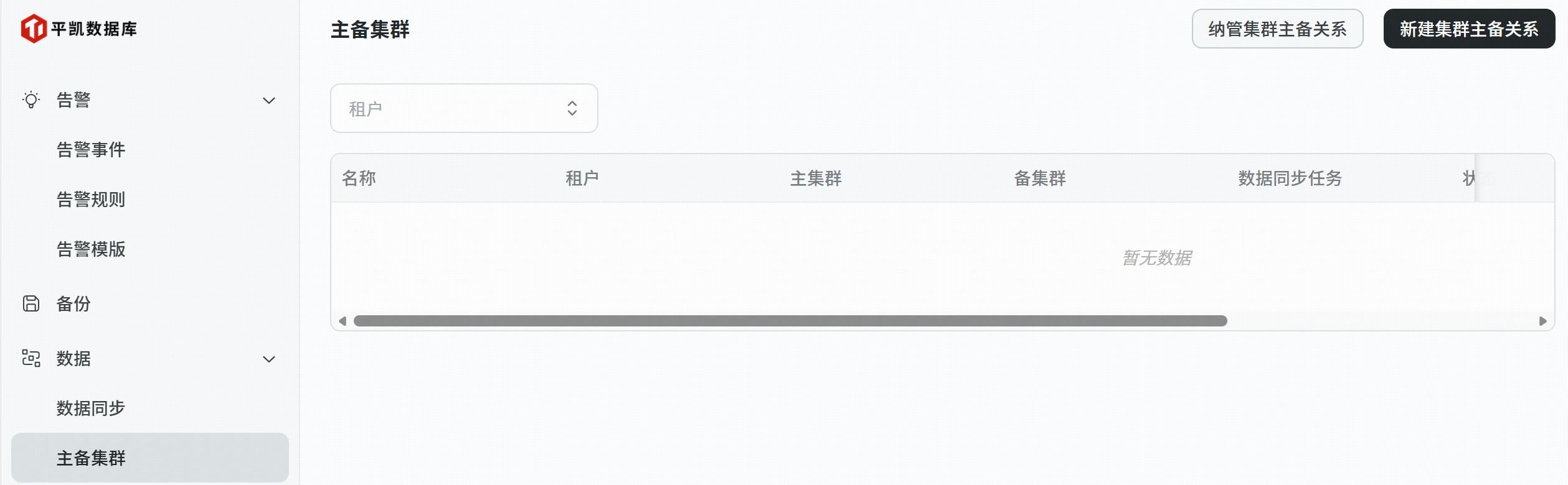 主备集群页面可以方便运维同步通过白屏化的方式来查看主备集群的关联关系以及同步状态。可以直接纳管现有的主备集群,也可以新建主备关系。