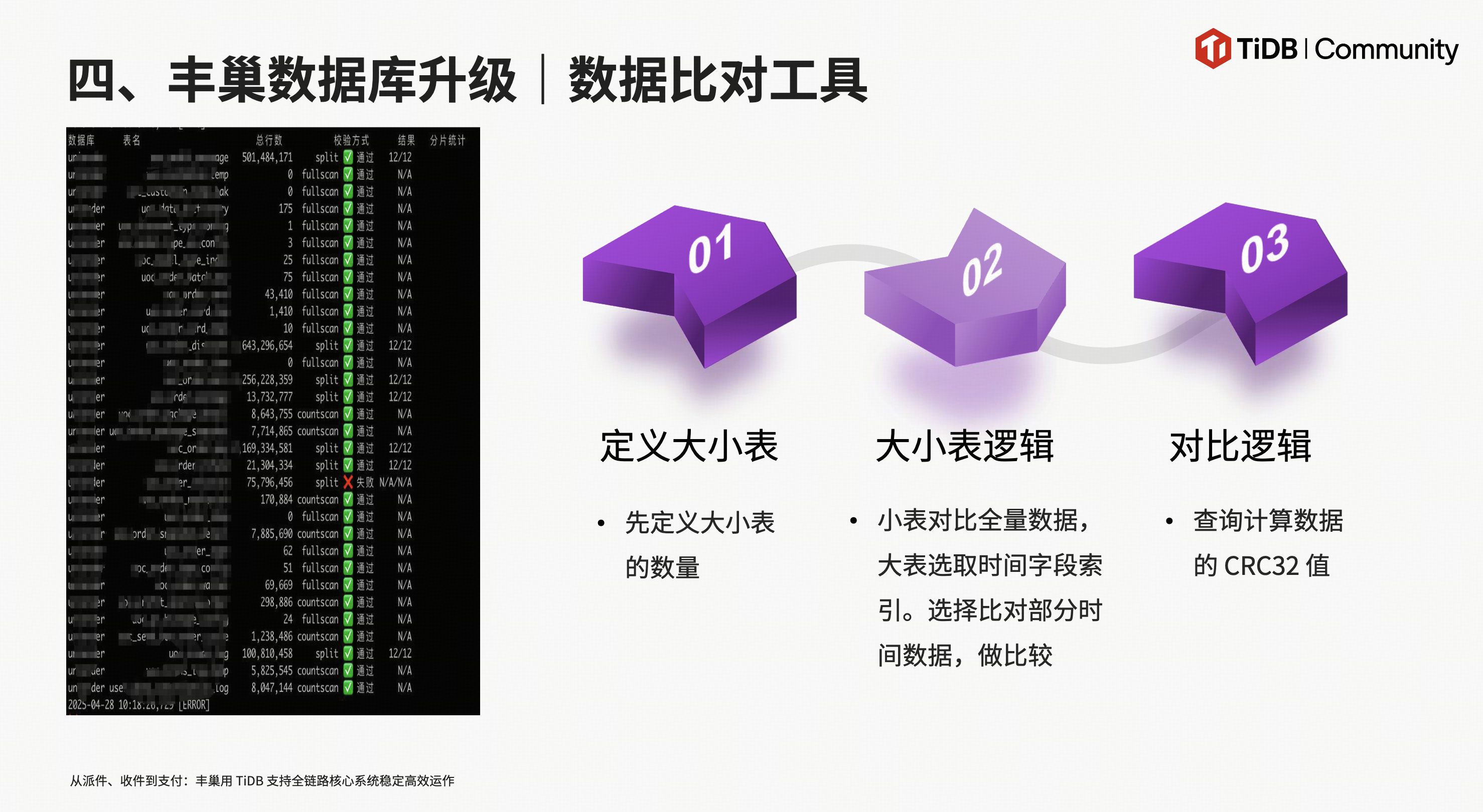 在 SQL 兼容性方面,重点关注 DDL 与 DML 语句语法变化,通过自动化测试工具与人工审查结合,覆盖 99% 以上核心 SQL 场景;性能回归验证中,采用 TPC-C 基准测试模型,对比关键 SQL 执行效率,重点监测查询响应时间与吞吐量,确保升级后性能提升至少 10%;高负载稳定性验证则模拟生产环境高并发压力,参考 Gartner 稳定性评估模型,保障系统在持续高负载下仍能达到 99.99% 的可用性标准。在数据校验环节,丰巢自研了一套数据比对工具帮助更快的进行数据分析。