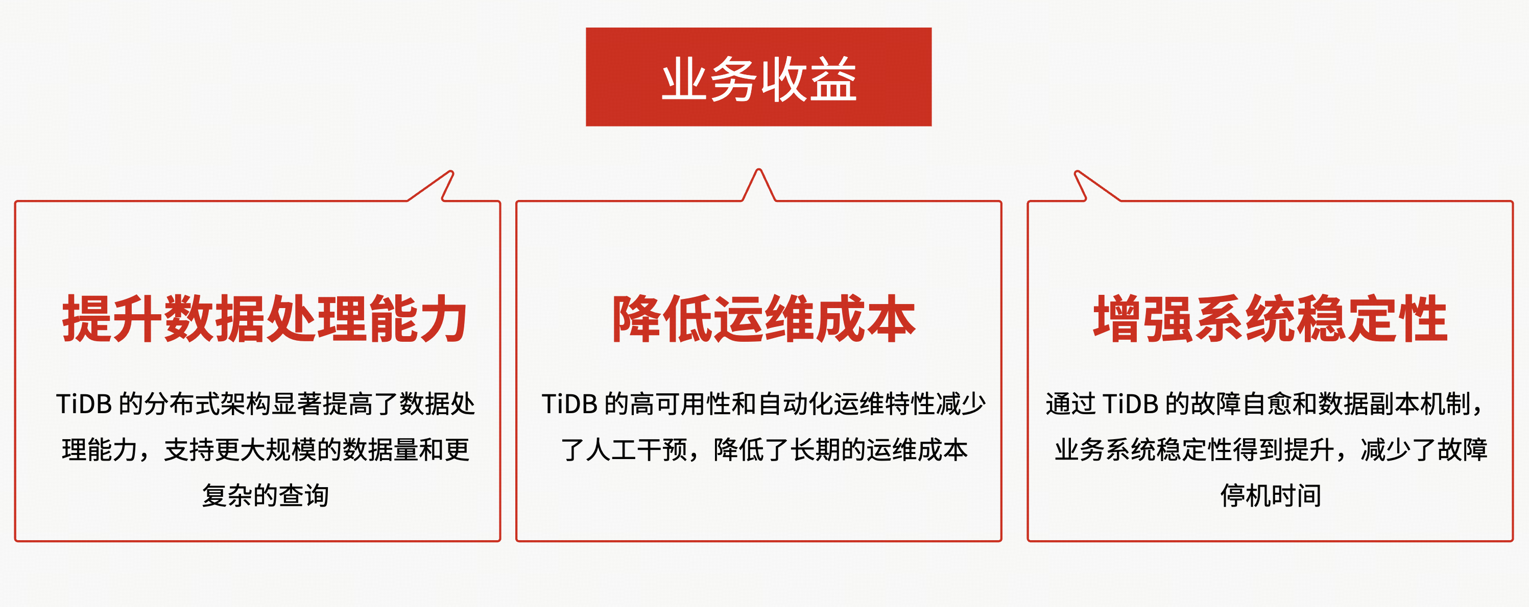 引入 TiDB 为丰巢带来了显著的架构简化和业务收益。在架构简化方面,TiDB 内置的分布式事务和一致性协议,减少了对 Mycat 这类传统中间件的依赖。同时,TiDB 实现存储与计算分离,通过 TiKV(存储层)与 TiDB Server(计算层)的紧密配合,实现统一架构管理,运维复杂度大幅下降。