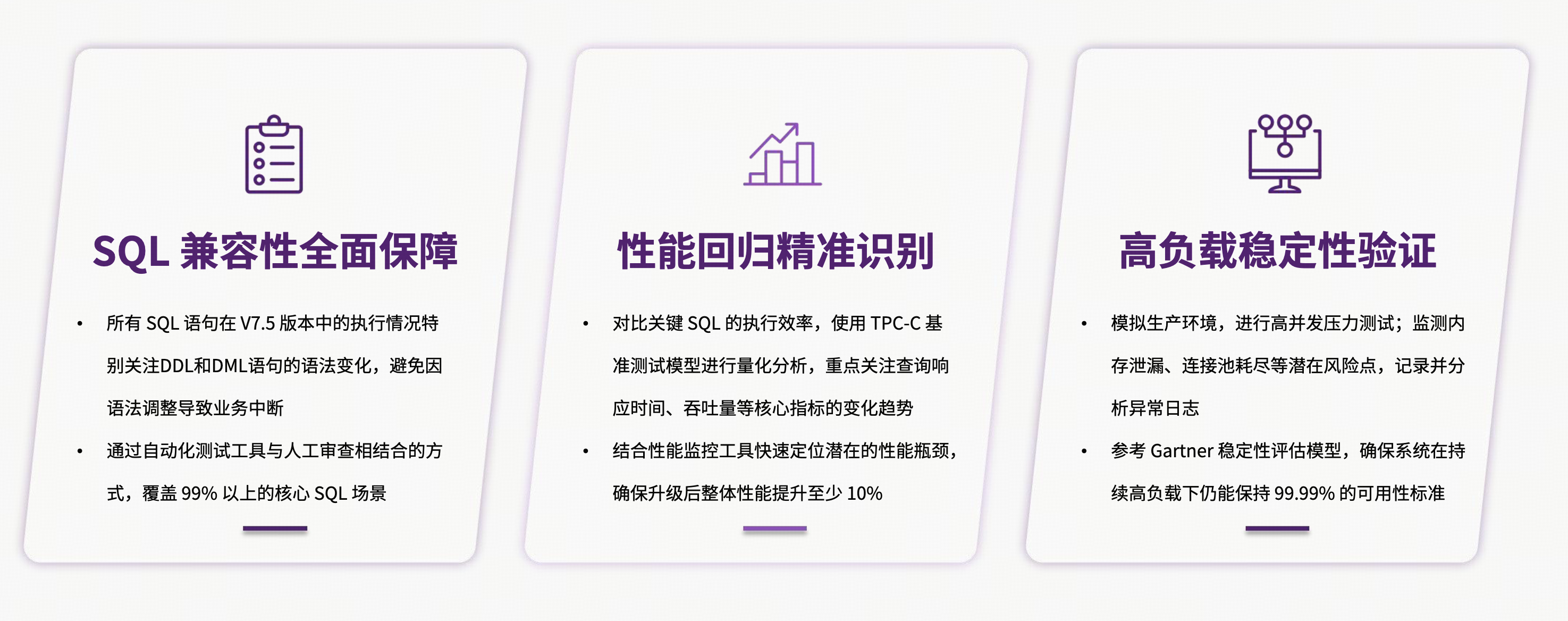 丰巢的升级目标明确:平稳过渡至 TiDB v7.5 LTS,实现业务零感知过渡,确保数据一致性,并借此提升系统性能与业务价值,为未来发展奠定坚实的技术基础。为了实现这一目标,丰巢团队在升级前进行了极其周密和详尽的核心验证工作。