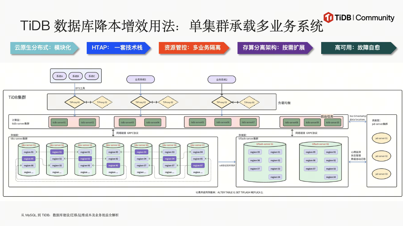 在 TiDB vs MySQL Meetup 活动中,TiDB 解决方案架构师深度解读了 TiDB 替换 MySQL 从调研测试到迁移上线全流程的实操方案、技术优势、成本效益以及分享了具体的降本增效实践案例,为企业数据库替换迁移及架构优化提供了极具价值的指引。从 MySQL 到 TiDB:调研、测试、迁移、上线全流程实施方案