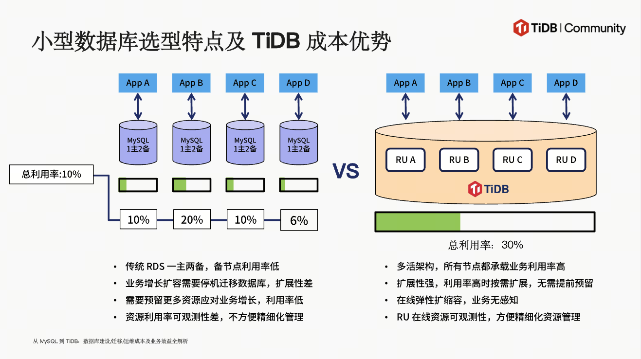 初始建设成本方面,对于大型 MySQL 系统,TiDB 可简化复杂架构,减少数据冗余和硬件成本;小型 MySQL 整合时,TiDB 提升资源利用率,降低综合硬件成本。迁移成本上,TiDB 提供全链路迁移工具,涵盖数据迁移、比对、回放和回退,简化实施过程,降低成本与风险。运维成本层面,TiDB 简化安装部署,减少高可用问题,提升扩缩容和 DDL 效率,缩短数据闪回周期,极大降低运维投入。