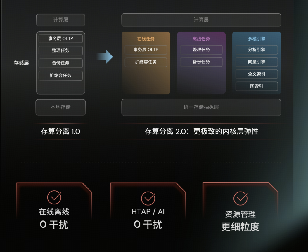 极致稳定(深度解耦): 将在线交易、后台任务(如整理、备份)、AI 引擎等彻底拆解。这意味着后台任务与核心业务在 CPU 和 IO 层面彻底物理隔离,即便负载动态变化,也能确保核心业务 P99 延迟“零抖动” 。