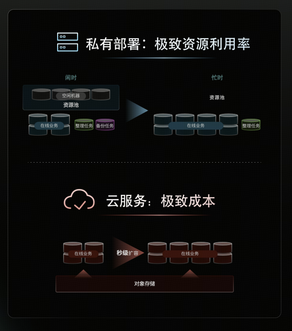 - 私有化部署:极致的资源灵活性。受限于物理硬件难以做到秒级扩容,但得益于“存存分离、算算分离”,可以获得极致的资源隔离与分配灵活性——能够更细粒度地规划在线与离线资源,将硬件资源的利用率与分配灵活性推向极致。