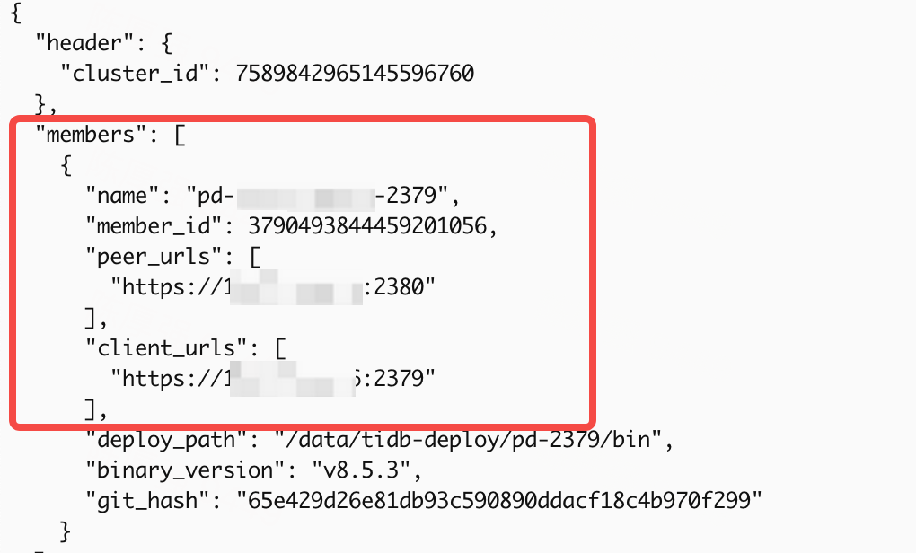 tiup ctl:v8.5.3 pd -u https://ip:2379 member --cacert /home/tidb/.tiup/storage/cluster/clusters/tidb-test/tls/ca.crt --cert /home/tidb/.tiup/storage/cluster/clusters/tidb-test/tls/client.crt --key /home/tidb/.tiup/storage/cluster/clusters/tidb-test/tls/client.pem