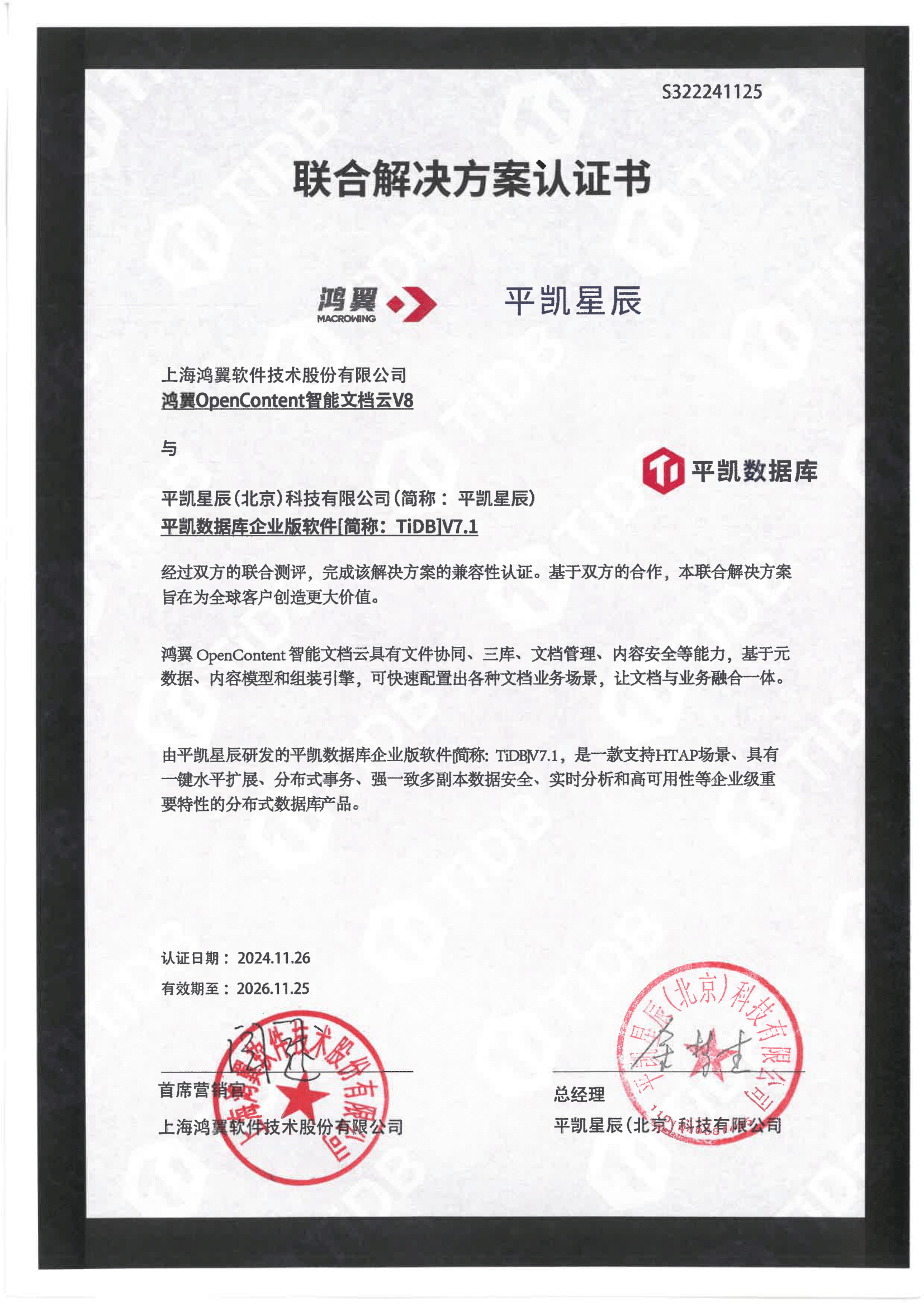 平凯数据库(TiDB 企业版)与鸿翼“鸿翼 OpenContent 智能文档云 V8” 完成技术互认证,合作聚焦企业非结构化数据管理痛点,通过“ECM(企业内容管理)平台+分布式数据底座”的深度融合,为金融、政务、制造等行业客户提供自主可控、安全高效的文档全生命周期管理解决方案,推动企业内容管理从“合规存储”向“价值挖掘”升级。