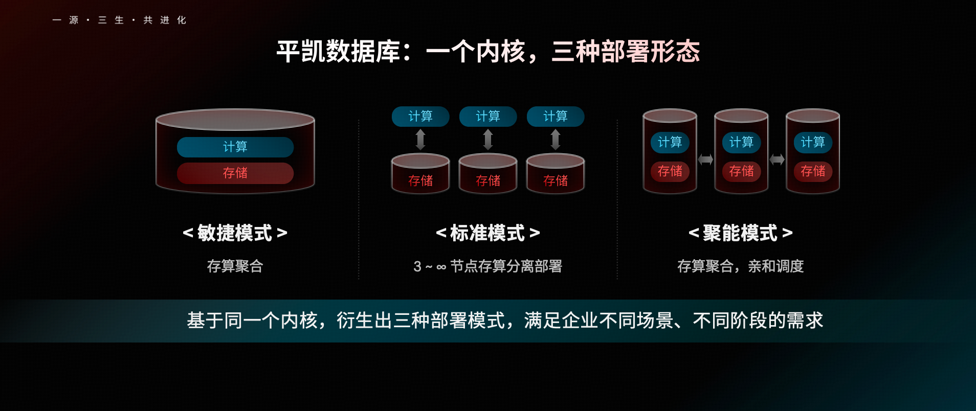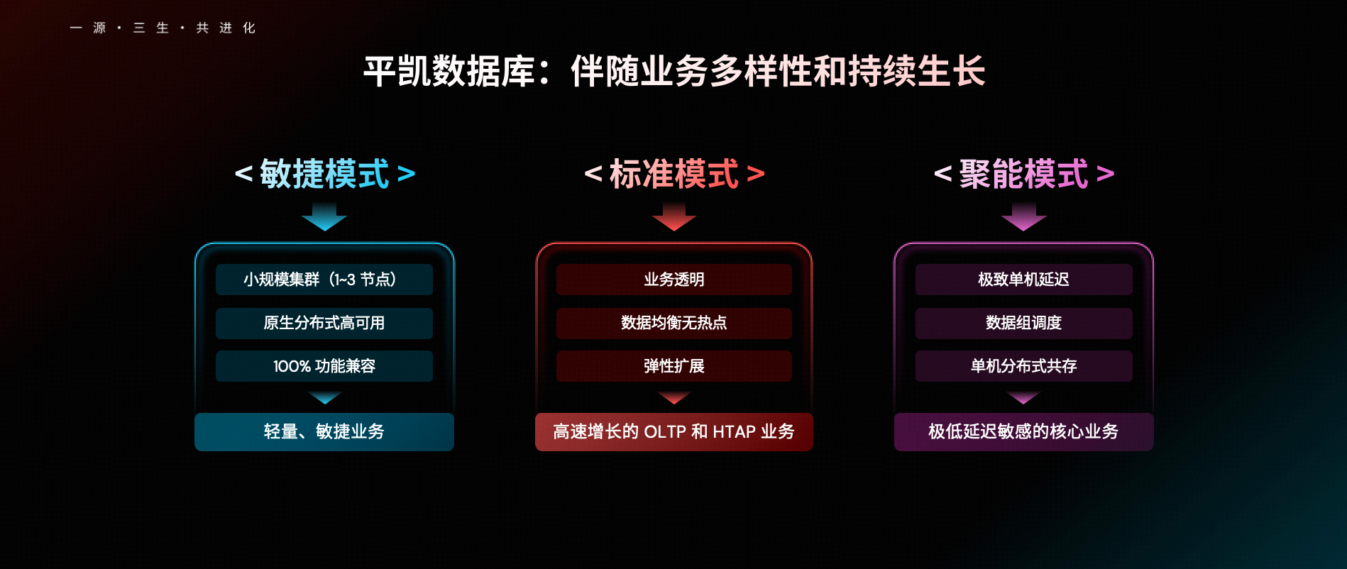 一直以来,数据库选型面临“水平扩展、业务透明、极致性能”难以兼得的“不可能三角”,结合客户在选型时面临的业务场景多、技术路线多等复杂困境,本次发布会,平凯数据库给出了解决方案——基于同一个内核,衍生出“敏捷模式、标准模式、聚能模式”三种部署模式,满足企业不同场景、不同阶段的需求。