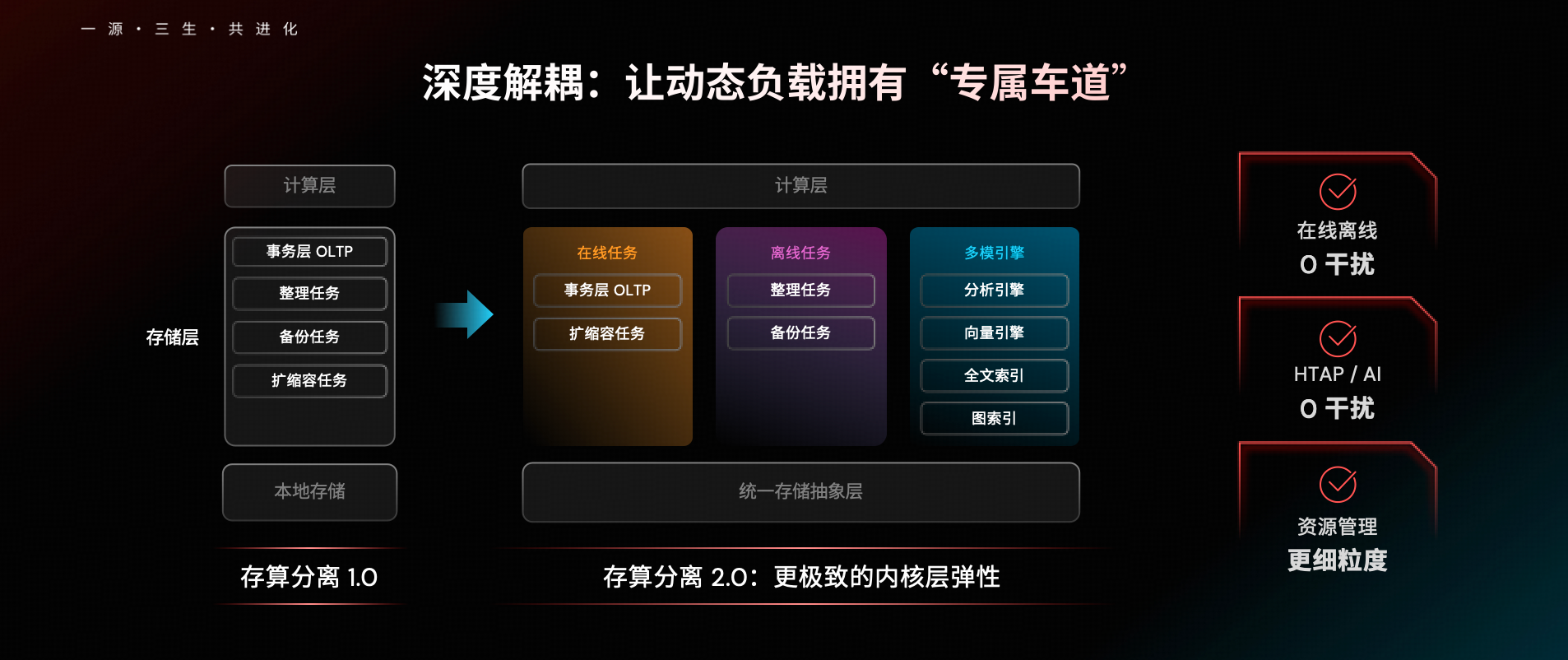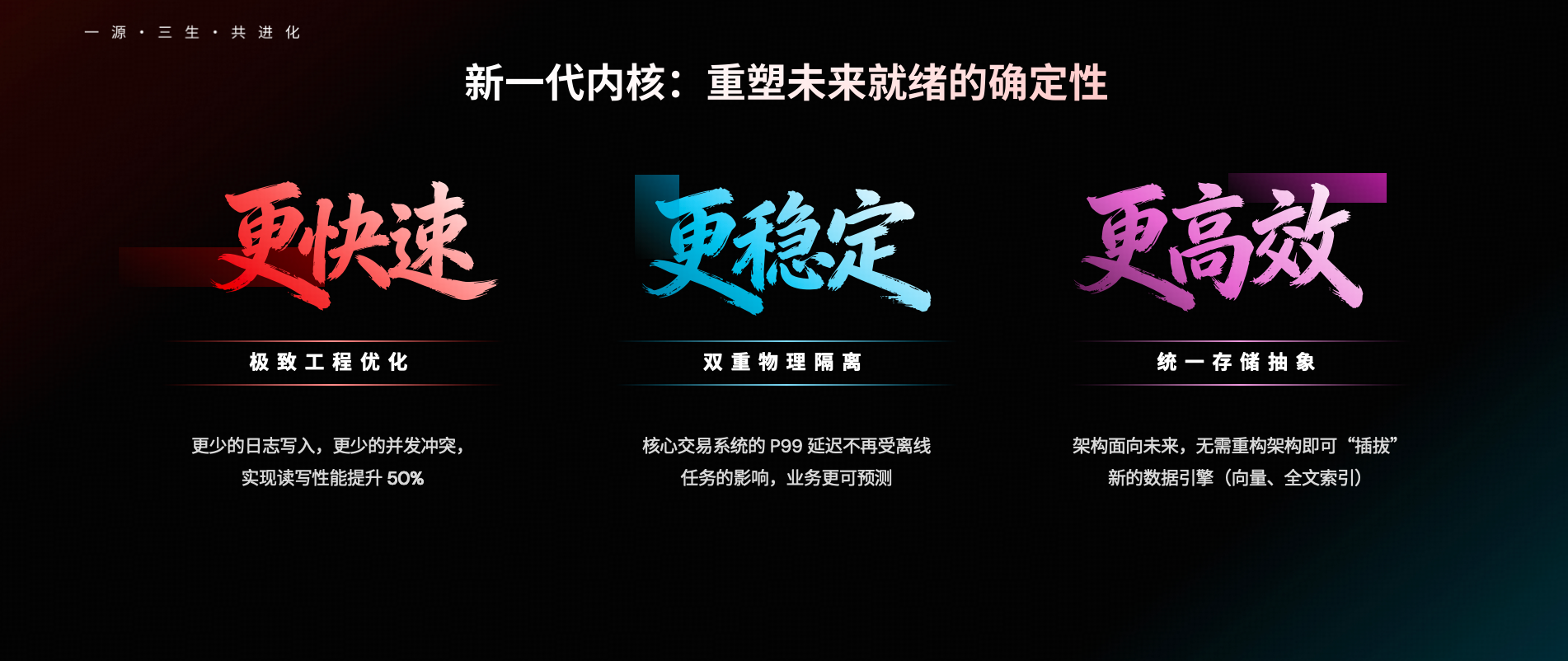 这种设计理念体现了极强的技术前瞻性:不再仅仅针对确定的业务负载进行优化,而是为 AI 时代不可预测的脉冲式流量和多模态数据需求预留了架构空间。无论是传统的交易处理,还是未来 Agent 驱动的复杂工作流,新一代内核都能提供稳健、高效的支撑,确保企业技术底座“十年不落后” 。